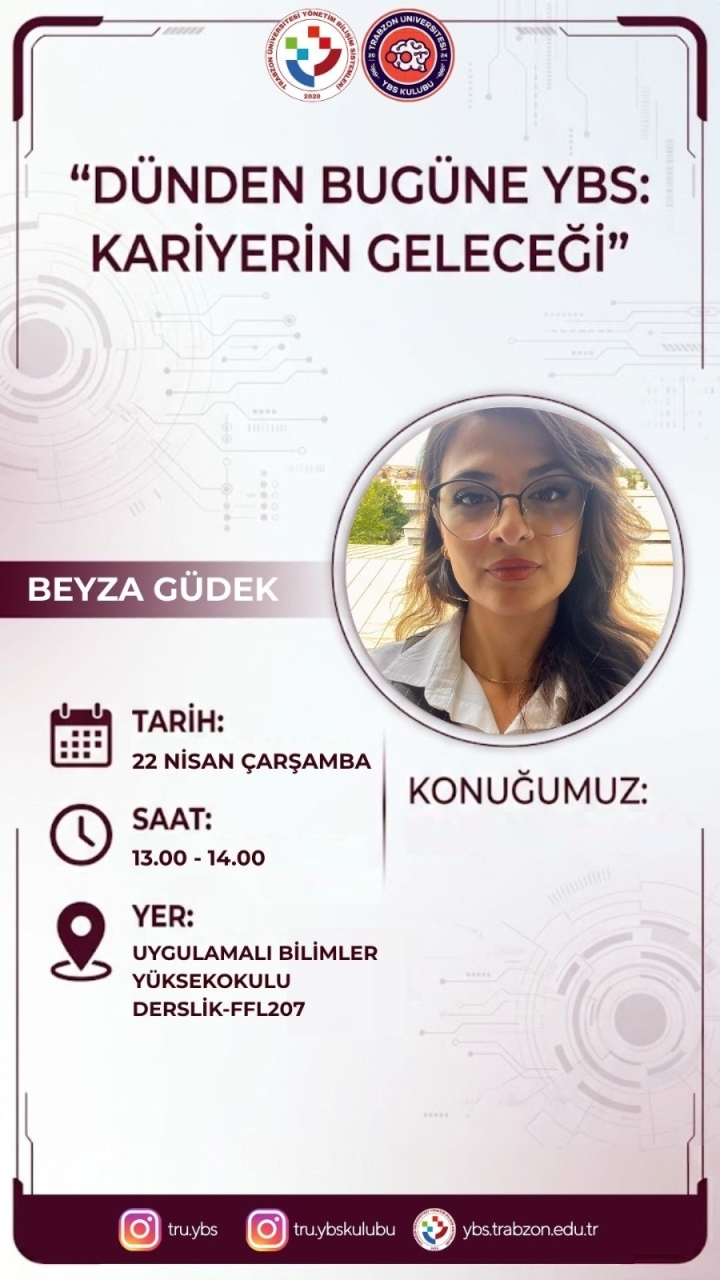 Yönetim Bilişim Sistemleri Bölümü ile Yönetim Bilişim Sistemleri Kulübü iş birliğinde düzenlenen “Dünden Bugüne YBS: Kariyerin Geleceği” başlıklı etkinlik, 22 Nisan 2026 Çarşamba günü gerçekleştirilecektir.