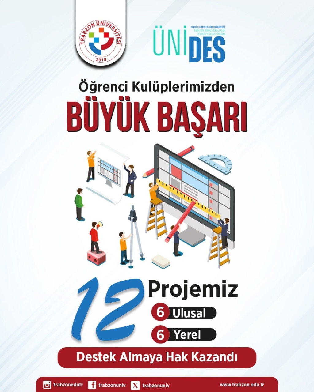 T.C. Gençlik ve Spor Bakanlığı Gençlik Hizmetleri Genel Müdürlüğü tarafından yürütülen Üniversite Öğrenci Toplulukları İş Birliği ve Destek Programı (ÜNİDES) 5. Dönem kapsamında destek almaya hak kazanan projeler açıklandı. Trabzon Üniversitesi (TRÜ), bu dönem 6’sı ulusal, 6’sı yerel olmak üzere toplam 12 proje ile desteğe layık görüldü. TRÜ, desteklenen bu proje sayısı ile "Ulusal Projeler"de Türkiye 4’üncülüğünü paylaşırken ÜNİ-DOKAP Üniversiteleri arasında ise Bayburt Üniversitesi’yle 2’nciliği paylaştı. Kabul edilen 12 ayrı projeleriyle öğrenci kulüplerimiz toplamda 1 milyon 173 Bin TL hibe desteği alacak.