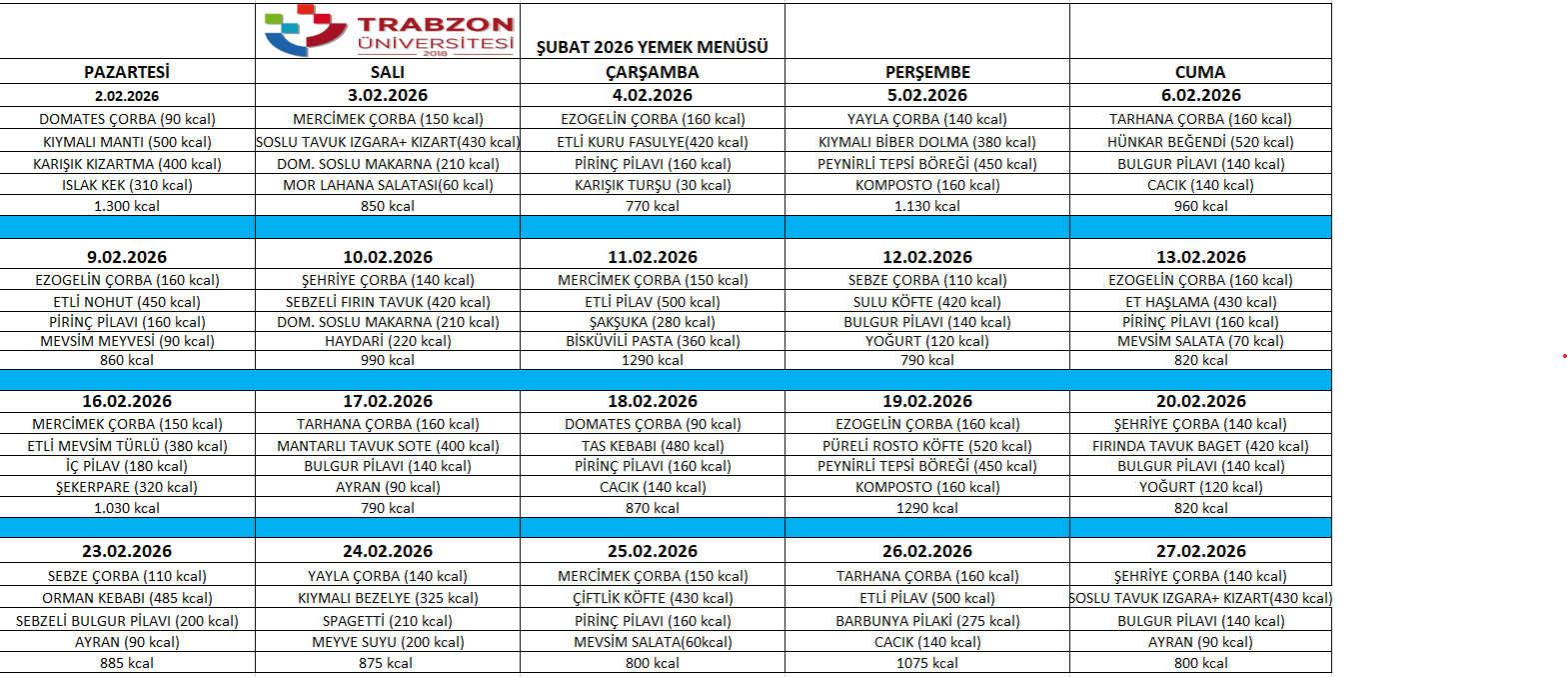2026 Şubat Ayı yemek listesini indirmek için